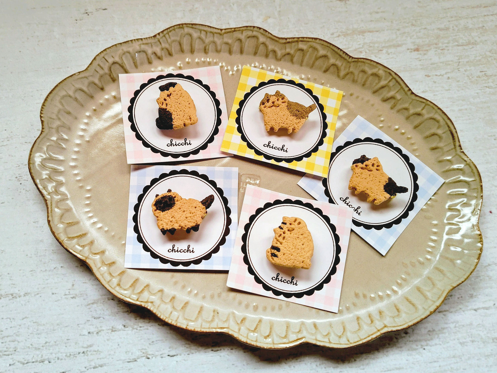 ・クッキーブローチ(お散歩・かしげ) 各660円