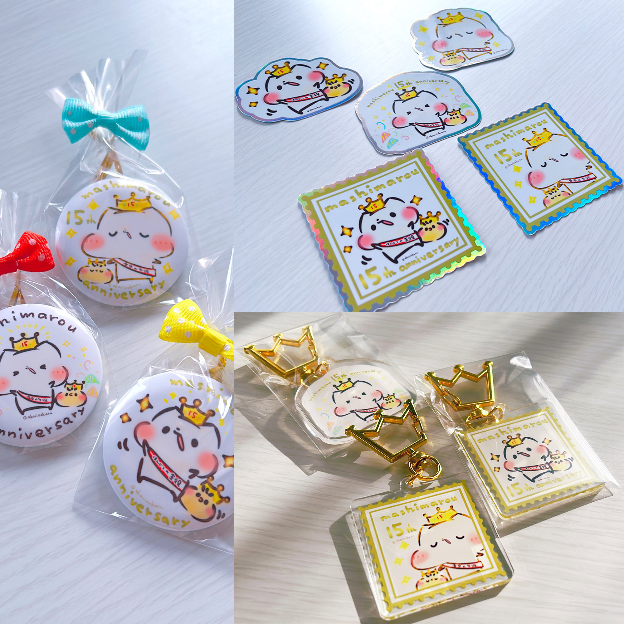 あわせて、15周年記念グッズの販売も予定しています。オリジナル切手やダイカットカード、ミニクッションに加え、アクリルキーホルダー(770円)、でか缶バッジ(330円)、キラキラオーロラでかステッカー(330円)などの記念シリーズも展開予定です。