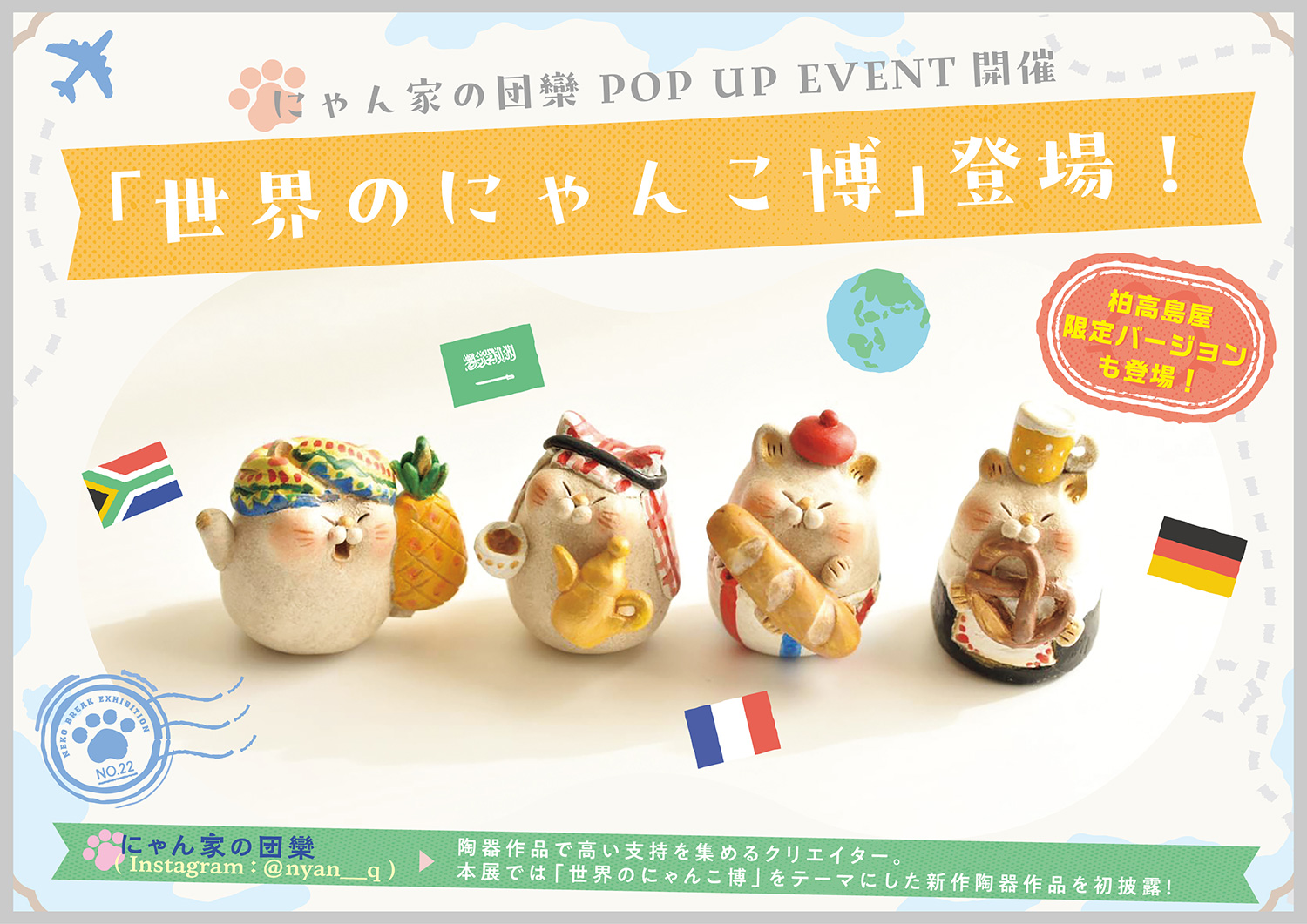 陶器作品を中心に制作するクリエイター。「世界のにゃんこ博」をテーマとした新作陶器作品を、本展で展示・販売予定です。また、柏高島屋限定となる国も登場するので見逃せない!!