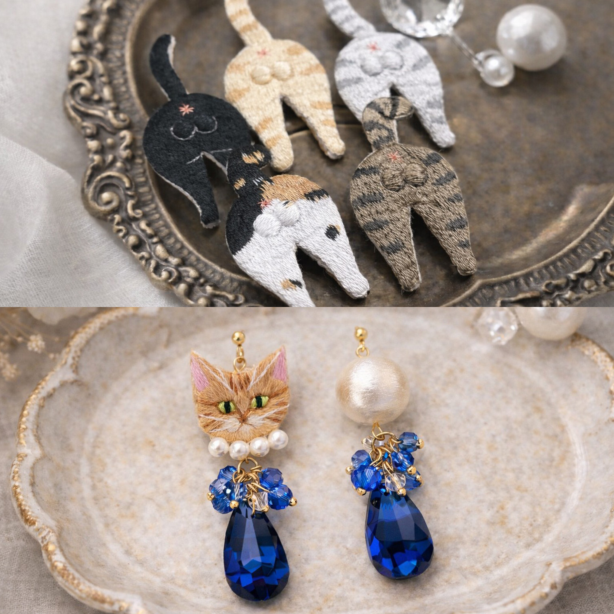 ・猫刺繍ピアス、イヤリング 3,600円