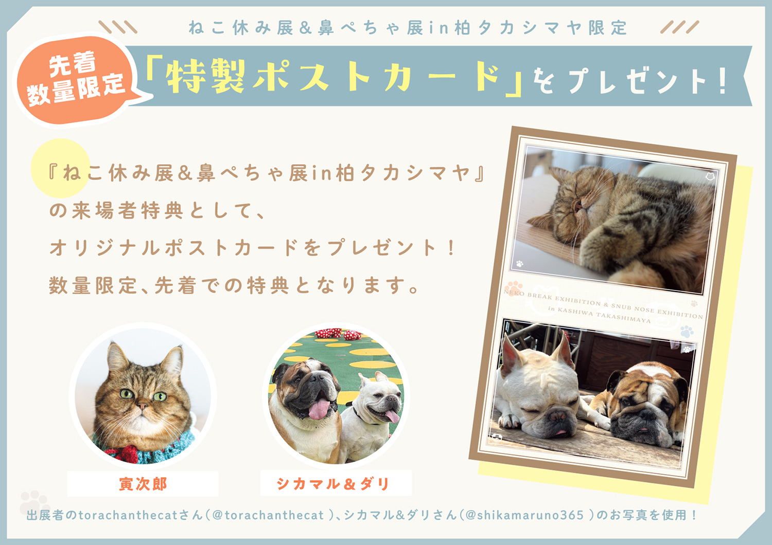 来場者特典として、柏タカシマヤ開催を記念したオリジナルデザインのポストカードを数量限定で配布します。また、会場内の様子を撮影し、指定のハッシュタグを付けてSNSに投稿した方を対象に、オリジナルグッズをプレゼントするキャンペーンを実施予定です。