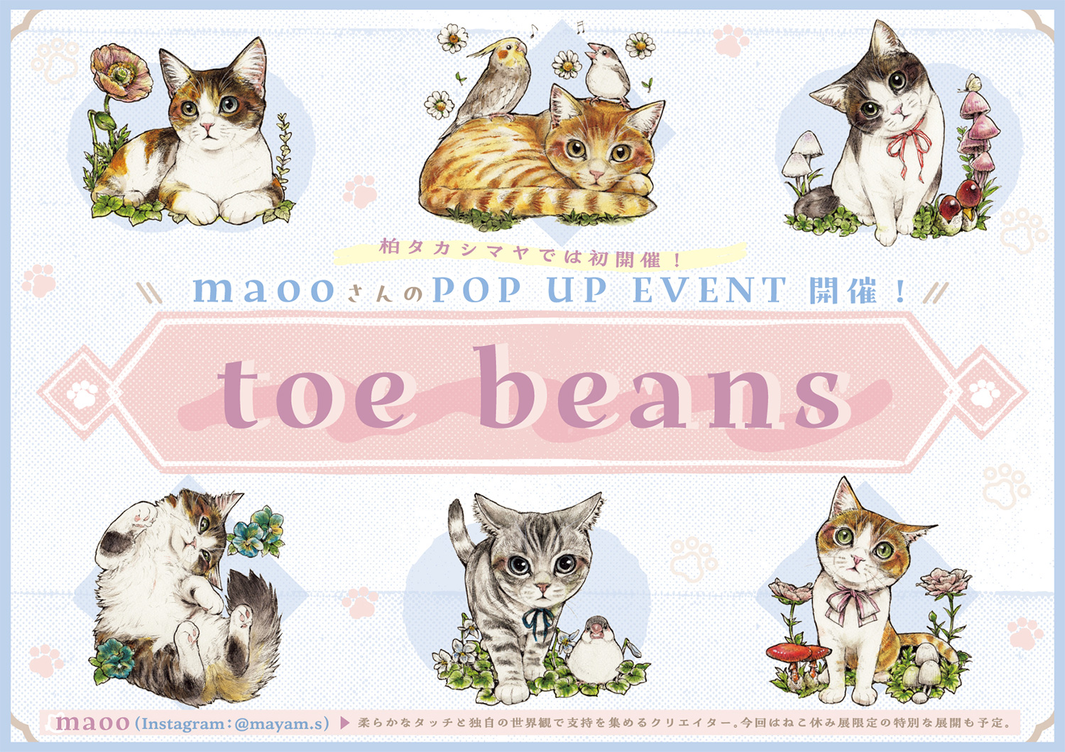柔らかなタッチと独自の世界観で支持を集めるクリエイター。初となるPOP UP EVENTでは、「toe beans」をテーマに掲げ、ねこ休み展限定の特別な展開を予定しています。
