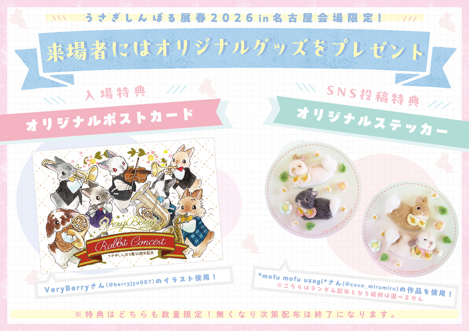 会場内は全て撮影OK!SNS投稿で、1日10組限定の「*mofu mofu usagi*」ステッカー、さらに先着2,000名には「VeryBerry」のイラストポストカードをプレゼント!